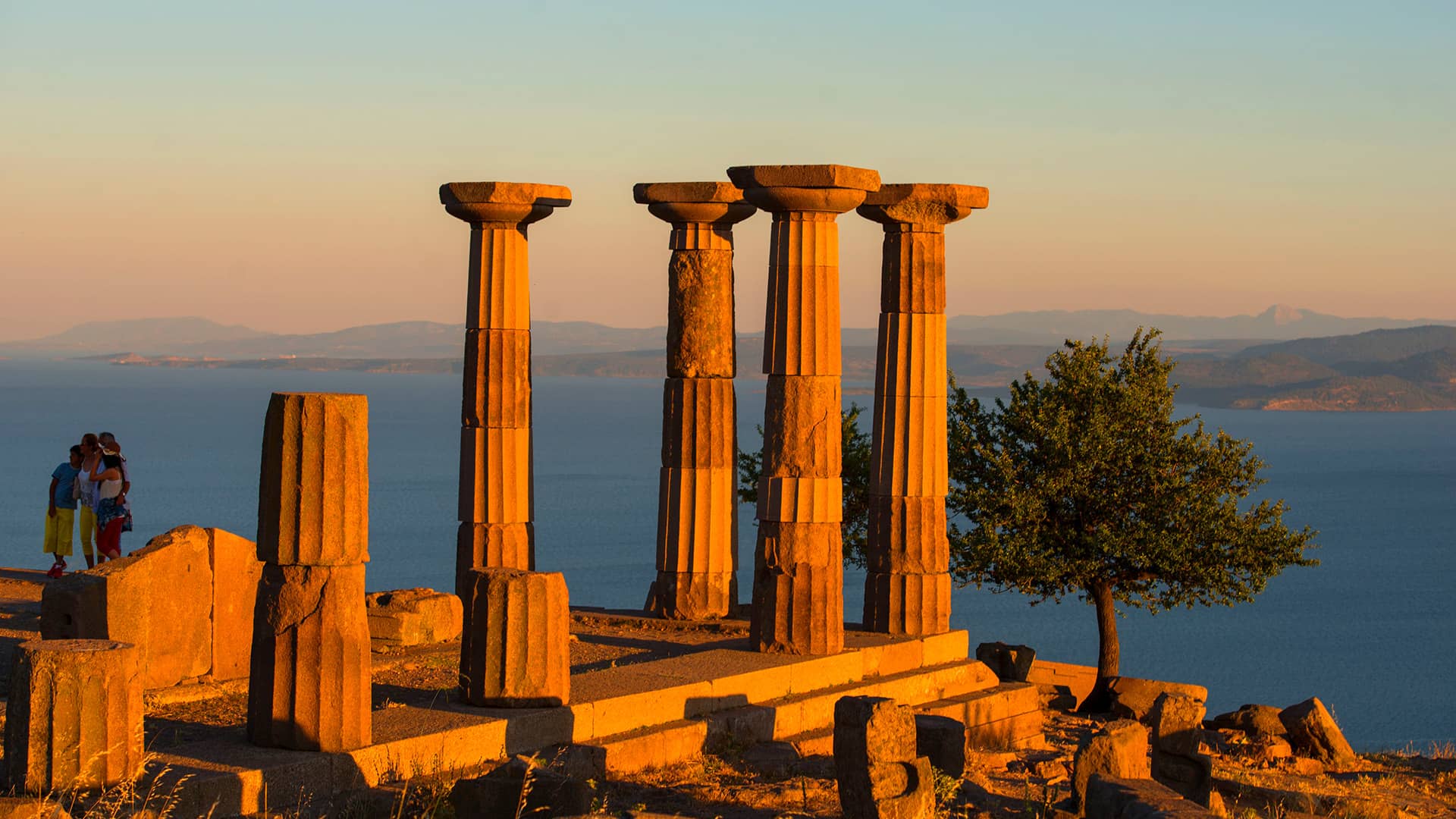 A significant portion of the 4 km long walls surrounding the city are still standing today. The Temple of Athena (Athena Tapınağı), located in the Acropolis, is one of the oldest Doric temples in Anatolia built in the Archaic Age. Among the ruins on the acropolis, the Temple of Athena is the best place to watch the magnificent view of Edremit Bay at sunset.