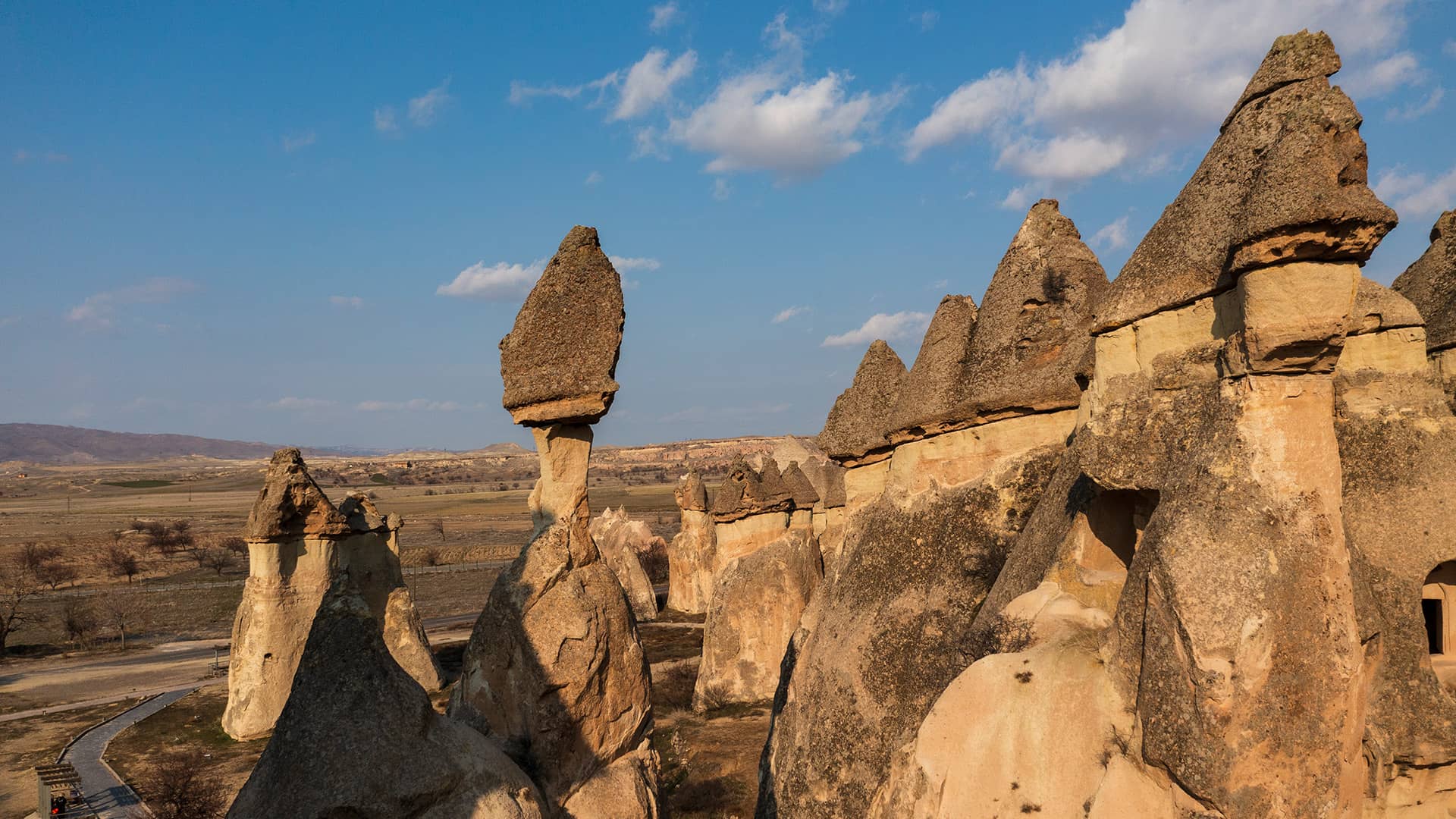 The sublime story of the land dates back millions of years ago to the eruption of the two volcanic mountains of Central Anatolia, the Erciyes and Hasan mountains. The tuff and basalt layering itself throughout the region then gets formed by the wind, and hot and cold air, turning amorphous into the mystic fairy chimneys for miles to flaunt. As the reinvention of nature has completed, earthlings began to show their faces and added invasions, riots, and migrations to its history being written.