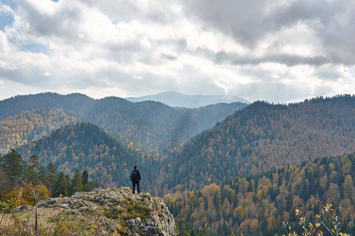 Man watches the Autumn landscape from a valley surrounded by a forest on a rock from a cliff