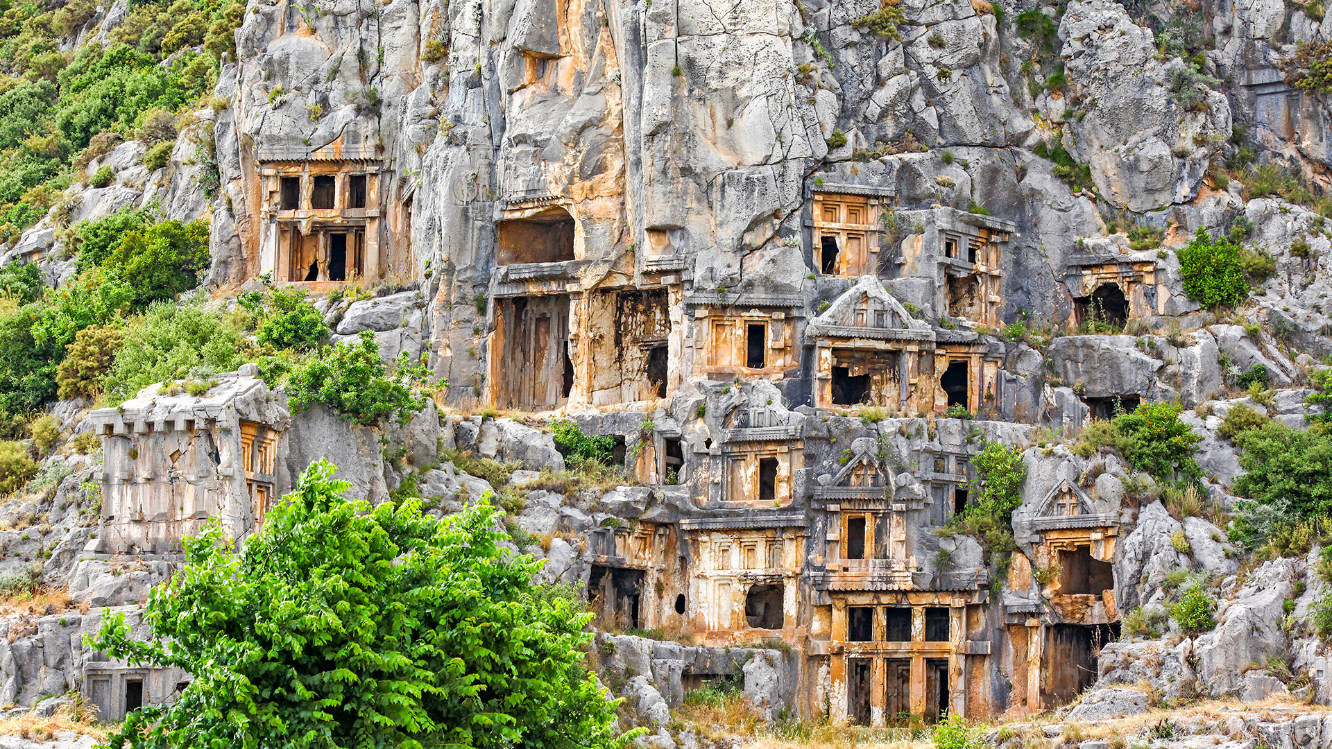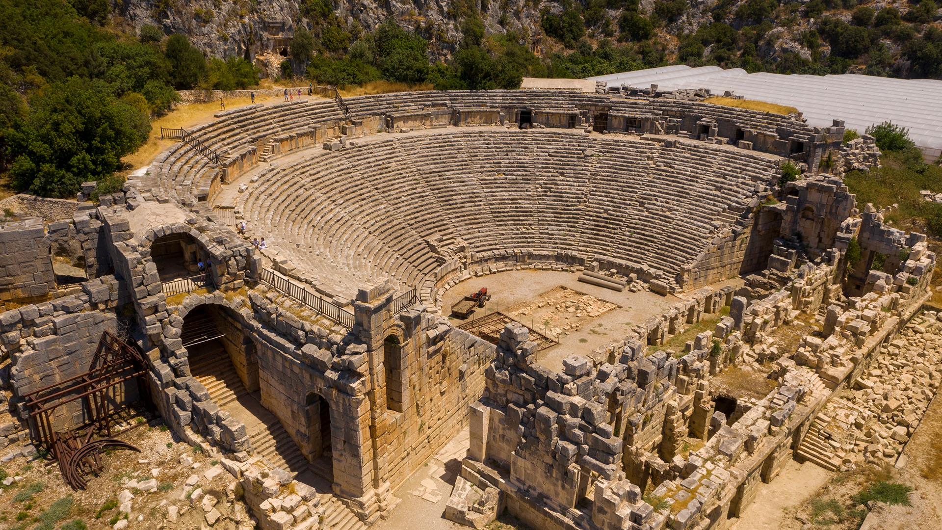 Myra, is located 140 km to the west of Antalya city and today the town is called Demre. The city can be reached via the coastal road from Antalya to Fethiye with spectacular views. The visitor is welcomed with the magnificent view of the Lycian Rock Cut Tombs, located within citrus orchards and next to the great theater from the Roman Period.