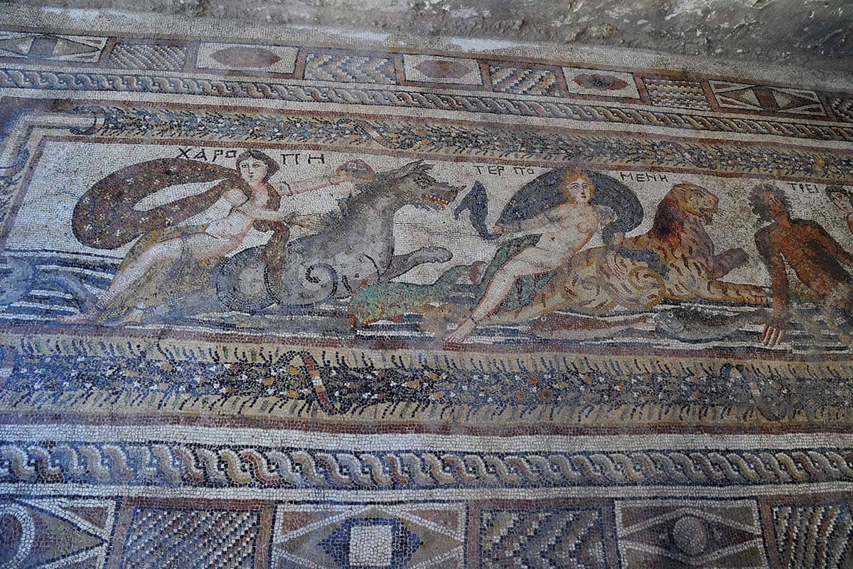 As you enter this villa, your journey begins by the encounter with three sea nymphs called Nereids, almost completely naked. They wave a piece of garment from their dress, and they are depicted as they ride wild beasts on top of the waters.
