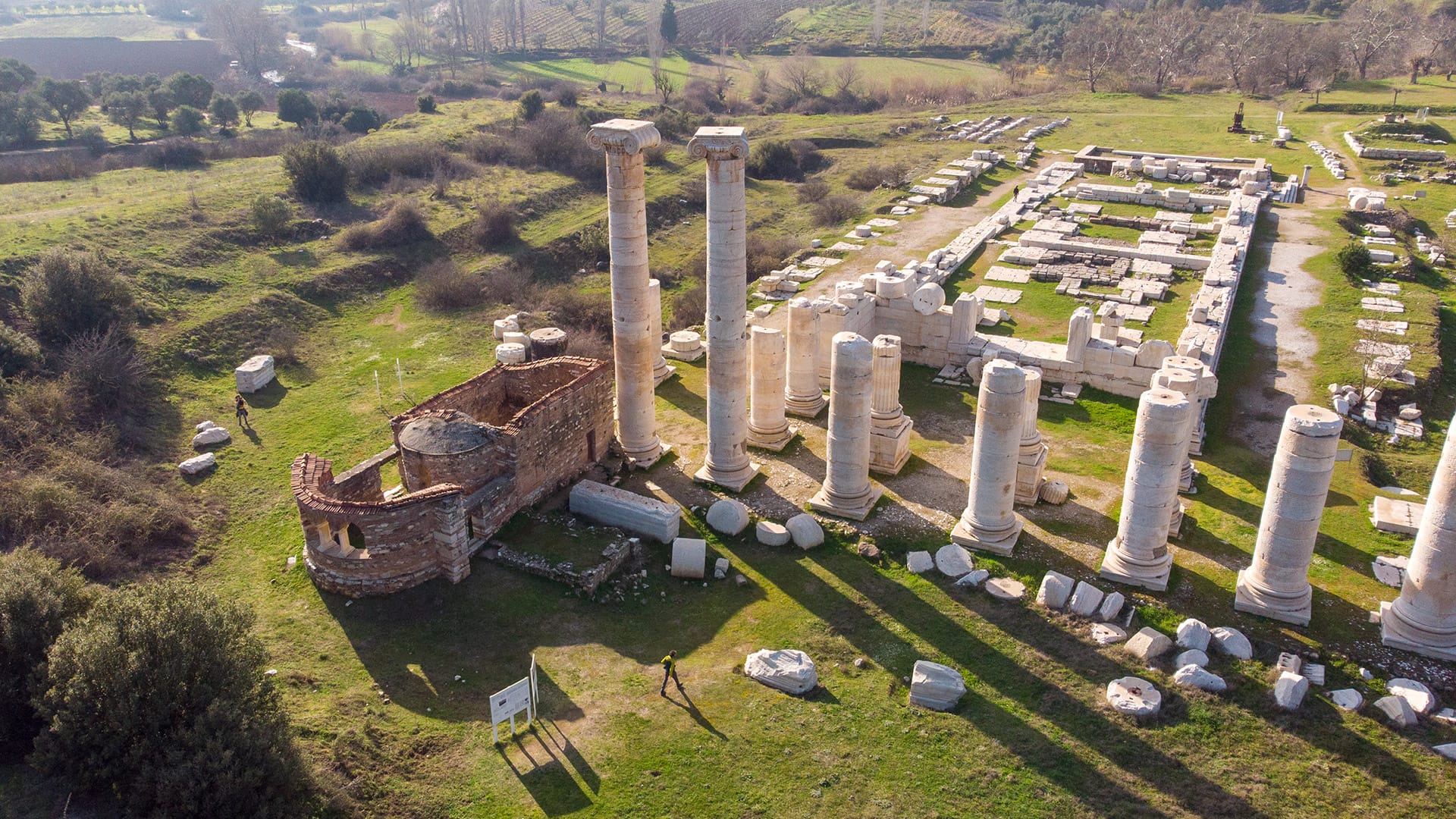The city today lies on both sides of the modern road. The most important architectural structures uncovered with excavations are the ancient synagogue and gymnasium. To the North is the magnificent Gymnasium and synagogue, and in the south part, one can see the great temple of Artemis and a church attached to it. The synagogue is a uniquely beautiful building built in the 3rd century CE. The gymnasium is next to the synagogue. It is understood that the ornate eastern front of the Gymnasium was built at the beginning of the 3rd century CE. The arched shops along the edges of these two buildings date back to the Eastern Roman Period.