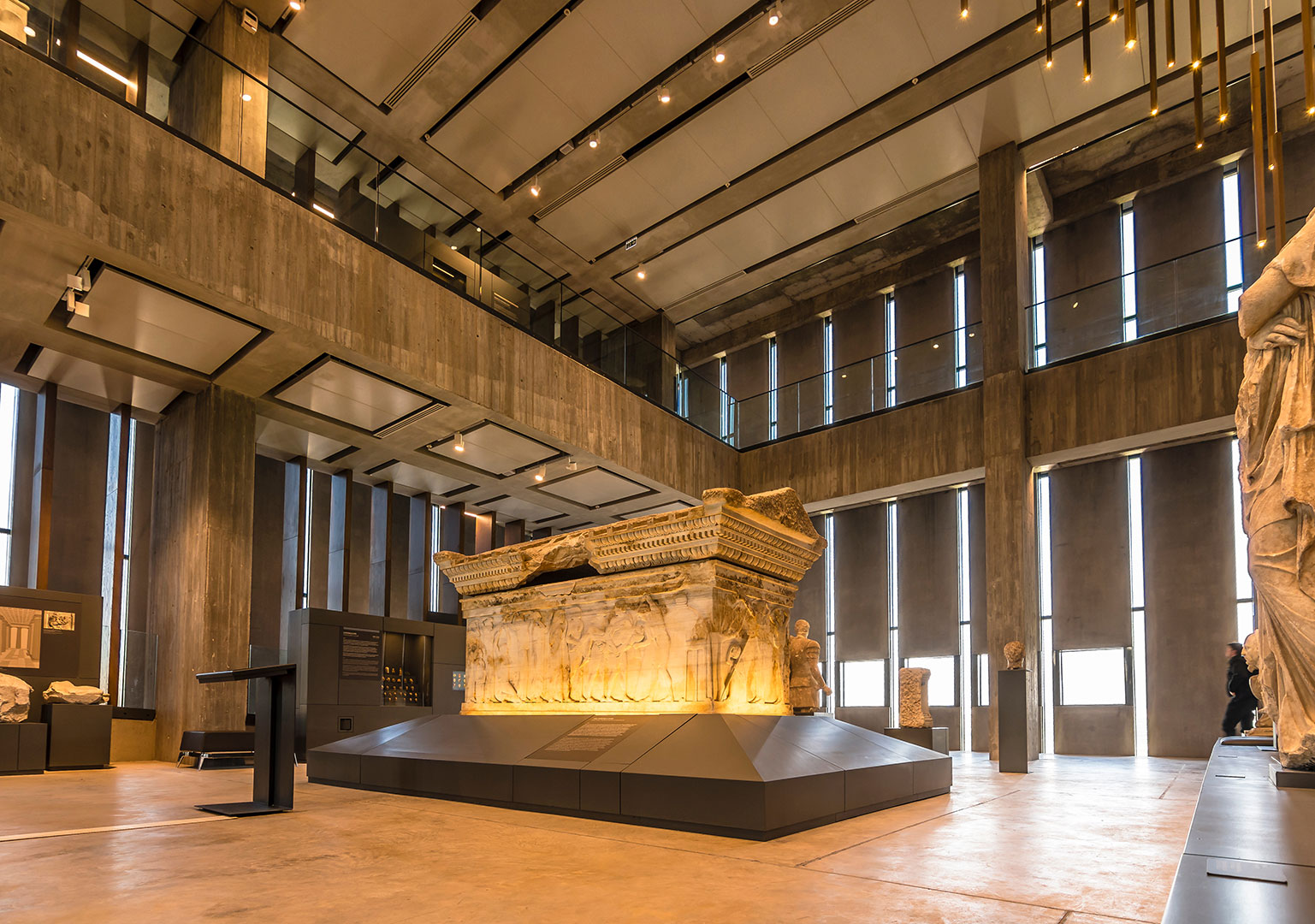 Visitors can climb to each exhibition floor via the ramp. In the niches on the walls of the ramp, different layers of Troy are described with tombstones, large sculptures, stage animations, and large size photographs. In the circulation band, which is the entrance area of the museum, the science of archeology, archaeological and archaeometric dating methods, terms such as "neolithic, chalcolithic, bronze age, iron age, mound, restoration, conservation" are explained through diagrams, drawings, texts and interactive methods in order to provide an orientation to the visitor before the ongoing exhibition floors.